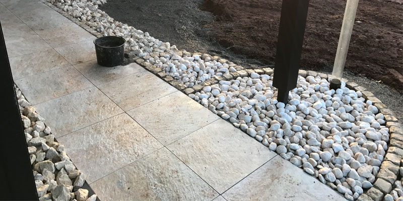 Helle Außenplatten mit Kiesgestaltung – Fliesen Kugel