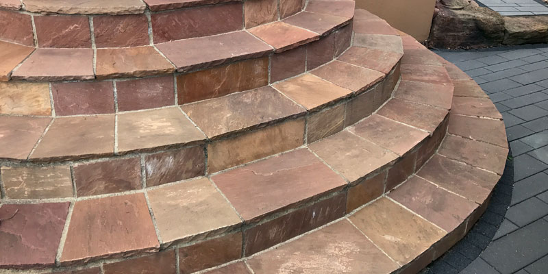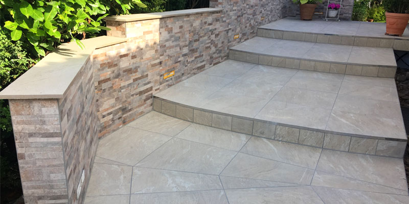 Außentreppe mit Naturstein in warmen Farbtönen – Fliesen Kugel