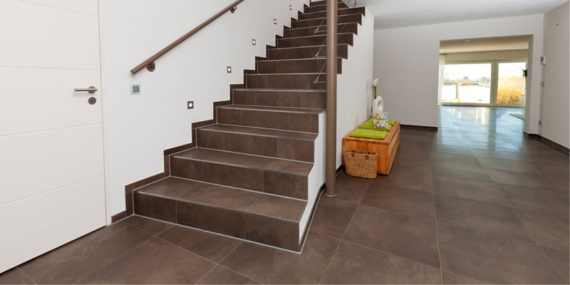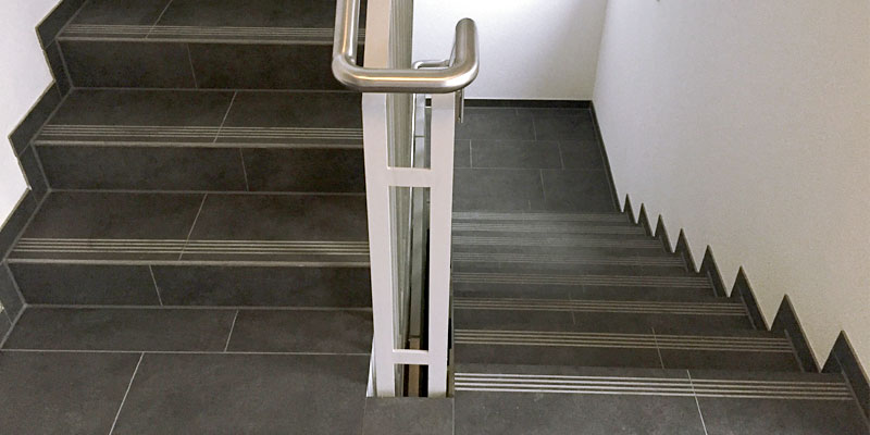 Treppenhaus mit dunklen Bodenfliesen – Gewerbefläche von Fliesen Kugel